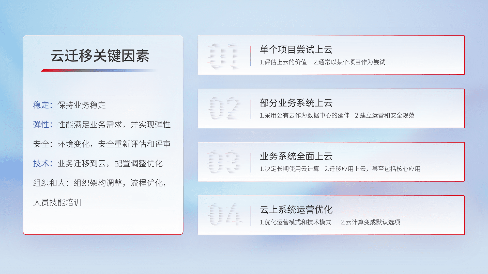 结合实际业务,,,从规划设计、、云平台选型、、、云原生改造、、数据迁移、、、、集成交付,,迁移全过程为客户识别最佳上云路径,,做好风险识别管理,,,,设计网络架构、、、、身份权限、、、、安全审计合规、、、操作审计、、日志审计、、监控告警策略、、、多站点容灾设计等,,对云上基础设施进行整体规划,,提升IT治理水平,,,以满足弹性、、、、高可用、、、高性能的需求。。。